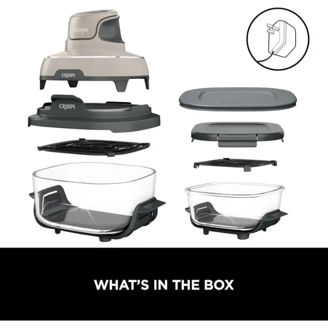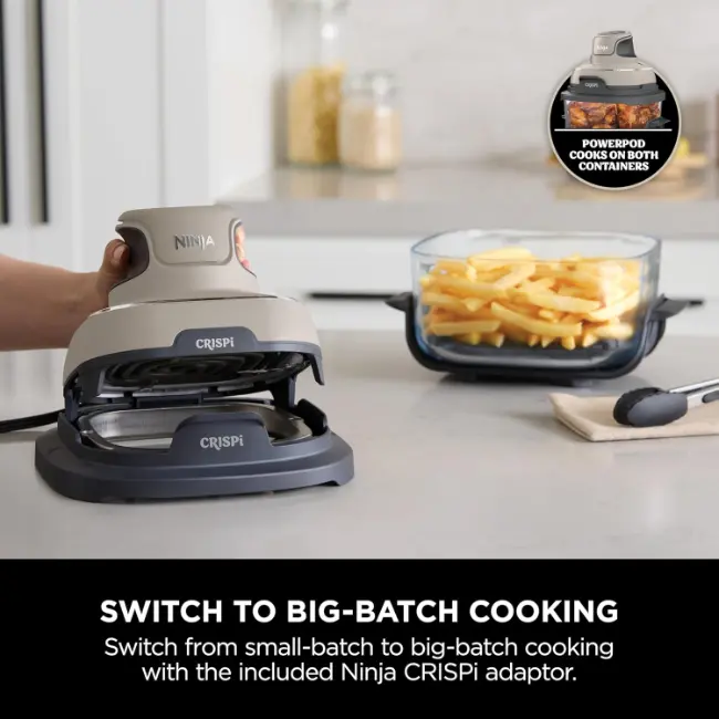 Meet the Ninja CRISPi 4-in-1 Portable Glass Air Fryer Cooking System, the power of a full sized air fryer, now in a portable cooking system. Simply snap the lightweight, handheld 1700-watt PowerPod onto one of the glass cooking containers to create family-size meals and personal portions with 4 cooking functions. Plus, cook with up to 50% less energy than a fan oven*.